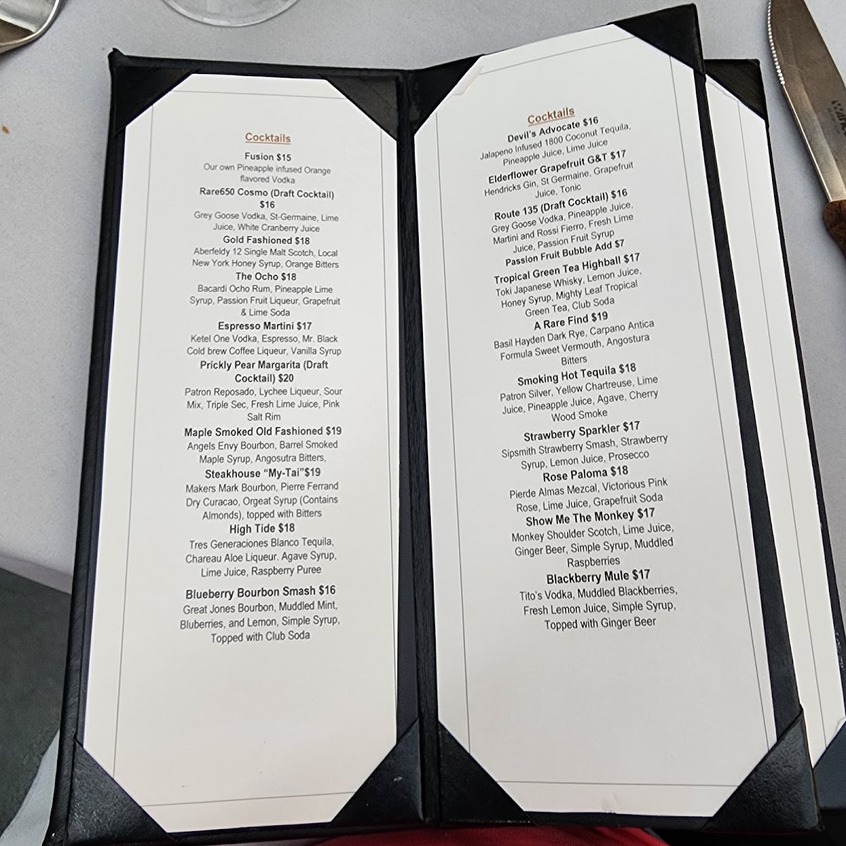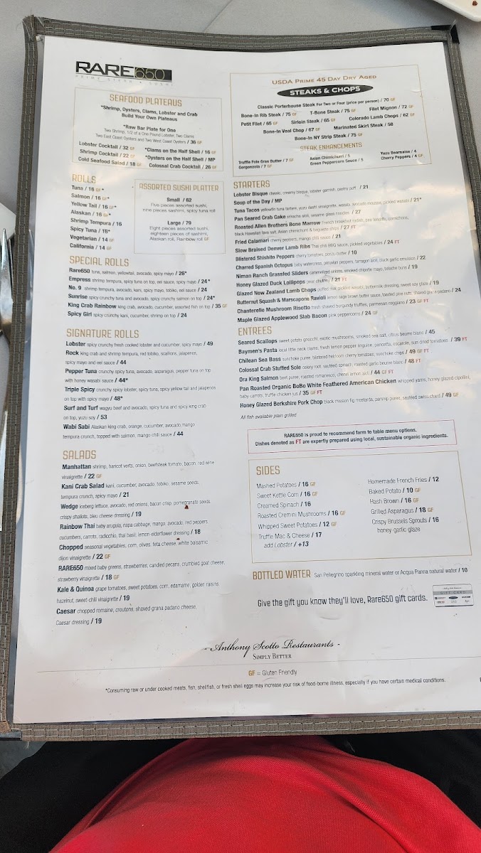 Cuisine Type: Rare650 specializes in a dual culinary artistry—prime steak and fresh sushi. The menu is a treasure trove for food lovers, featuring an array of choices from succulent steaks to mouthwatering seafood. Start your meal with a delightful French Onion Soup that boasts a rich, velvety broth topped with melted cheese, or indulge in the Lobster Bisque that's been raved about as one of the best around. The salads, like the Baby Arugula offering with strawberries and goat cheese, are fresh and thoughtfully crafted.